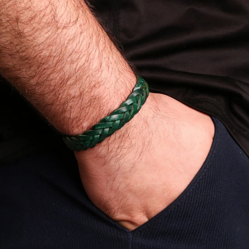 دستبند چرمی سبز، اکسسوری چرمی مردانه، دستبند مردانه استیل، دستبند مردانه اسپرت، فروشگاه Alango